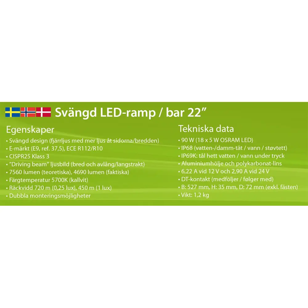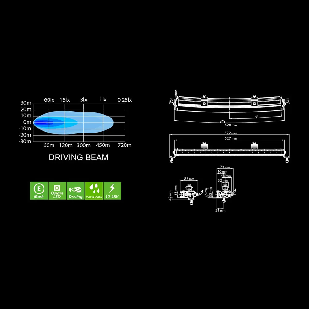 En svängd ramp ser ofta snyggare ut monterat på fordonet då många bilar har en aningen svängd front som en svängd (curved) ramp då matchar. Driving Beam "härmar" fordonets ordinarie ljusbild. Du får därmed en snarlik ljusspridning mot ditt existerande fordons halv- & helljus men förstärkt.